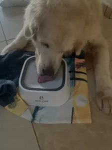 I adore this new bowl for my big golden shepherd. No more wet floors! She got the hang of it right away. It’s more like licking a lollipop for her now rather than slurping, so there’s no more mess.