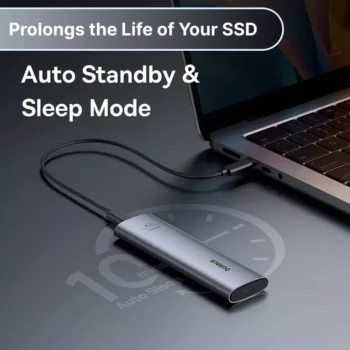 This SSD enclosure is not only convenient but also smartly designed for user-friendly operation. With plug-and-play functionality, there is no need for driver installations, making it easy to connect to laptops, phones, tablets, and even gaming consoles. Its compact and sleek design, combined with a durable aluminum body, ensures it can withstand everyday use while maintaining a modern aesthetic. Plus, the automatic standby and sleep mode after 10 minutes of inactivity helps conserve energy and prolongs the life of your SSD.