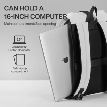 The main compartment features a dedicated padded slot that fits up to a 16-inch laptop, keeping your device secure and accessible. With a 16L capacity, this backpack easily accommodates all your daily essentials and clothes, making it perfect for 3-5 day trips. Two side pockets provide convenient storage for water bottles and umbrellas, ensuring you’re always prepared.