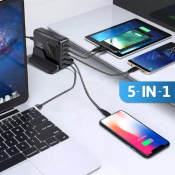 - Robust Output: Equipped with 2 A Ports and 3 C Ports, it’s versatile enough to juice up everything from phones to laptops.