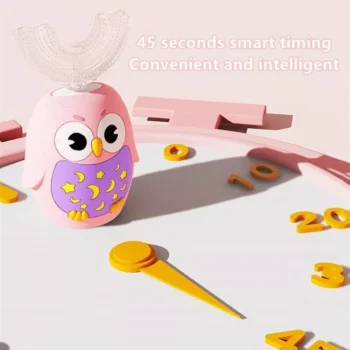 This isn’t just any children’s toothbrush. Our 360-Degree U-Shaped design ensures that every nook and cranny of your child’s mouth is reached, offering a thorough cleaning experience. With its owl-themed design, it’s a delightful addition to your child’s morning and night routine, making brushing a fun activity rather than a chore. The added benefit of blue light disinfection provides an added layer of hygiene, ensuring that your child’s toothbrush is free from harmful bacteria.