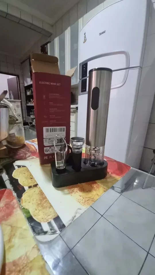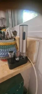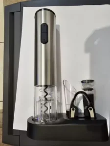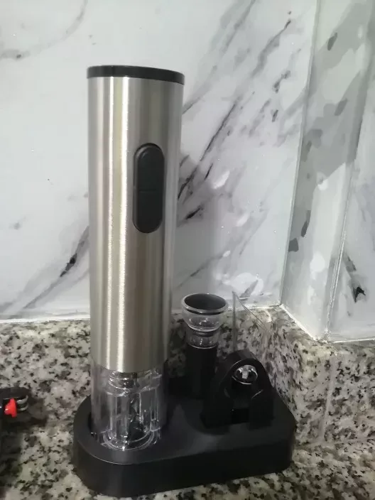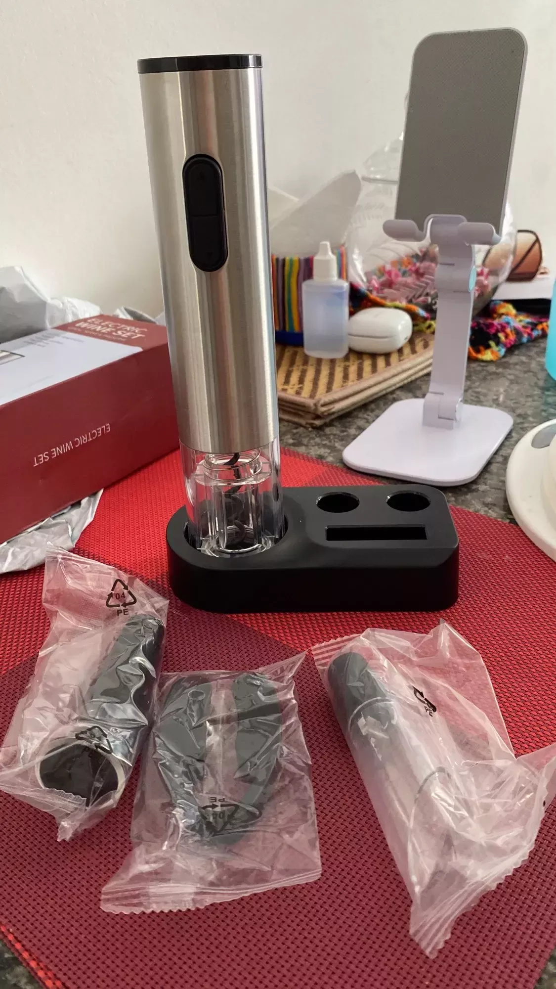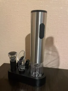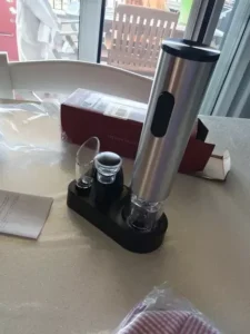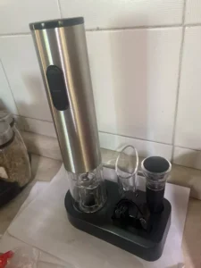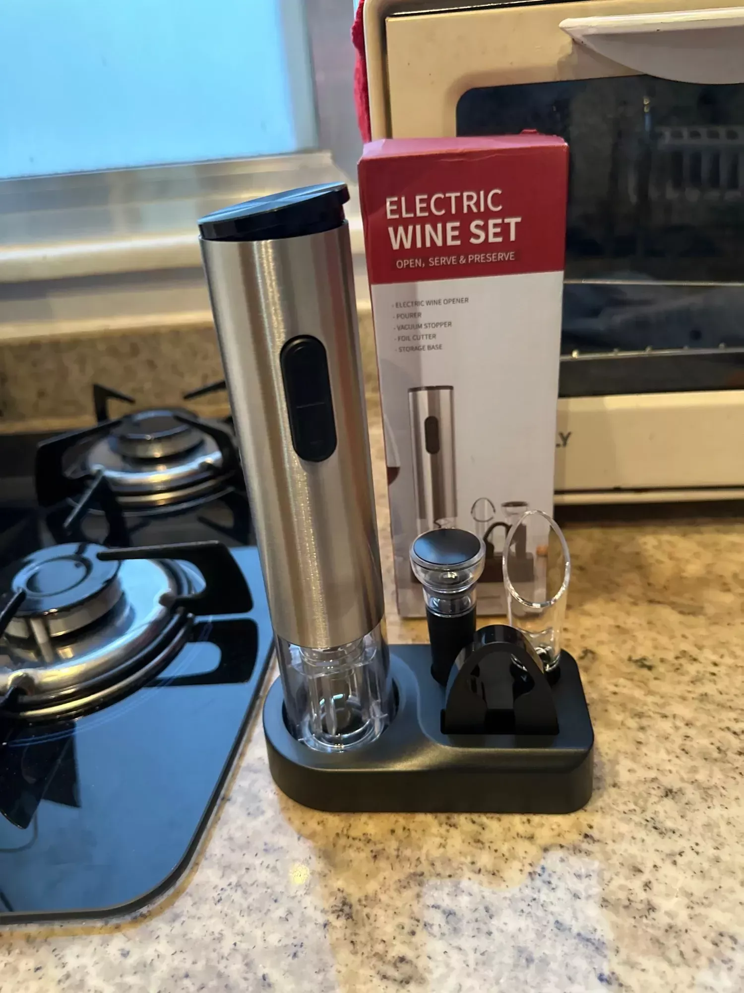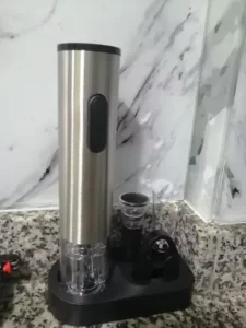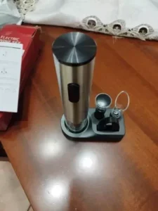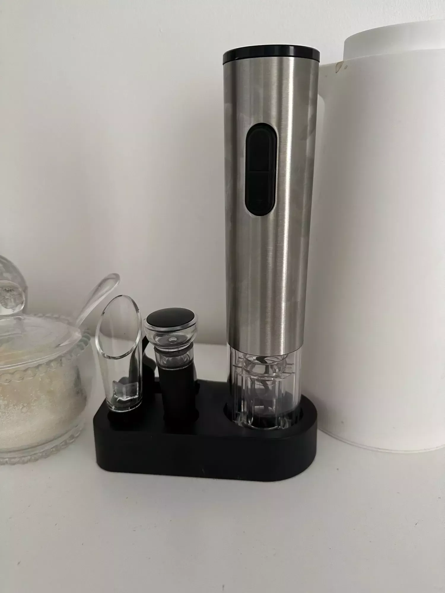 I find this wine opener very helpful because opening wine bottles was hard for me before. It’s strong, easy to use, and rechargeable. Plus, it comes with a stand.