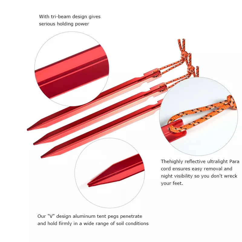 Our Heavy Duty 10-Pack Aluminum Tent Pegs are designed with the outdoor enthusiast in mind. The superior material and unique design make them stand out from ordinary tent stakes, offering unmatched durability and stability. Whether you’re setting up camp in soft forest soil or rocky terrain, these pegs will keep your tent anchored securely. The addition of reflective cords not only adds a layer of safety but also makes your camping experience smoother and more enjoyable.