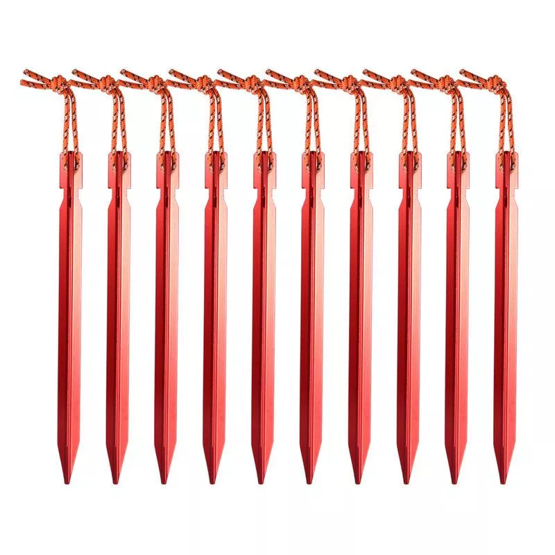 Introducing the Heavy Duty 10-Pack Aluminum Tent Pegs with Reflective Cord – the perfect solution for all your camping, backpacking, and outdoor needs. These premium-quality tent stakes are crafted from high-grade 7075 aluminum alloy, ensuring they are both lightweight and incredibly durable. Designed for maximum stability, these pegs will securely anchor your tents, canopies, and hammocks, no matter the terrain.