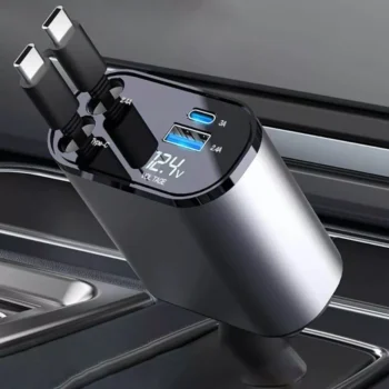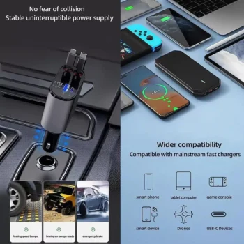 Experience the convenience of charging on the go with our High-Speed 4-in-1 Retractable Car Charger. Specially designed for modern-day travelers and tech-savvy individuals, this charger is a perfect blend of versatility and efficiency. Whether you’re commuting, on a road trip, or just need a quick charge, this charger is your ideal companion.