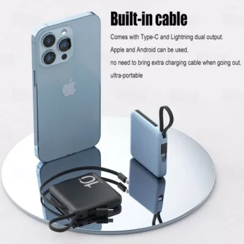 Stay charged and connected on the go with our sleek and mighty 10000mAh Power Bank. Designed for the modern lifestyle, this mini powerhouse fits right into your pocket or purse, ensuring you never run out of juice whether you’re navigating the urban jungles or on a wilderness adventure. Its integrated cables for both Apple and Android devices mean you can leave those tangled cords behind. Perfect for gamers, business travelers, and social butterflies who need their devices powered at all times!